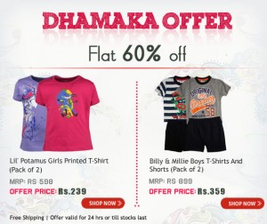 Buy: Lil’ Potamus T-Shirt Pack of 2 Rs. 239 | Billy & Millie T-Shirts and Shorts Pack of 2 Rs. 359