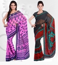 This saree literally symbolizes the joy of living! In eccentric collection of colors, this saree looks classy! The prints add beautiful definition to the saree. It will make you stand out from the others! Available in a set of 2!