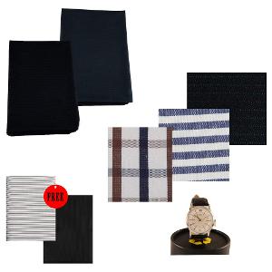 Pack contents: Blue & brown Alternate checked shirting, Blue Striped Shirting, Black Self Striped Trouser length, Navy blue suit length, Black suit length, Timex Watch, White Base Green striped shirting & Black Trouser length.