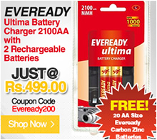Comes with 2 AA Size 2100mAH rechargeable batteries and 1 charger to recharge the batteries of AA & AAA Size Batteries + 20 AA Size Carbon Zinc Batteries Worth Rs. 220/- Non Rechargeable Free.