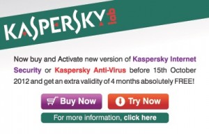• Activation of the products is mandatory to avail the benefit of the scheme during the scheme tenure. Customers/ Users have to activate their copies of new version of Kaspersky Internet Security or Kaspersky Antivirus on or before 2400 hrs on 15th October 2012 to get an extra validity of 4 months