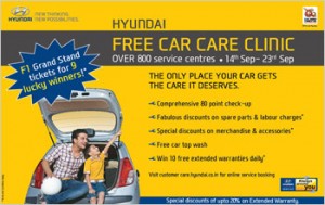 Free car care clinic is a nationwide activity being organized twice every year where Hyundai provide free 80 point checkup to its customers. The comprehensive 80 point check up includes an examination of the transmission, engine, electrical, underbody, exterior, AC etc. This activity is organized at around 530 locations across India checking & servicing more than 2 lac Hyundai cars over a period of 10 days.