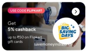 5% Cashback on Rs. 100+ Promo Code: FLIPKART (max cashback Rs. 50)