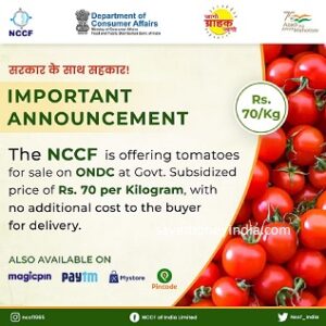 The NCCF is offering tomatoes for sale on ONDC at Govt. Subsidized price of Rs. 70 per Kilogram, with no additional cost to the buyer for delivery.