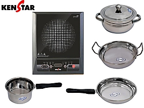 • Kenstar cooktop • one pcs handi 1 ltrs • one pcs handi lid with kob • one suace pan 1 ltrs • one kadai 2 ltrs • one fry pan 8 inch.
