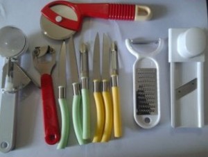 1 nova dry fruit cutter, 1 nova peeler cheese grater, 2 nova knife set(3pcs each), 1 excel pizza cutter, 1 excel ice cream scooper, 1 bottle opener cum tin cutter.