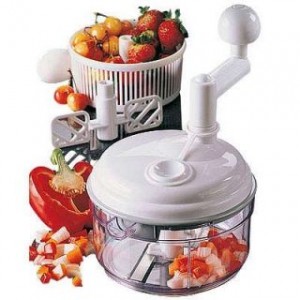 Now Chop Vegetables, make your Favourite Frozen drink, Fruit Sauces, Mik Shakes and Much More in Seconds. Mini Handy Chopper Chop vegetables and fruits for salads, salsa and more with this quick chopper/blender Manual food processor features Sharp, stainless steel chopping blades Chopper has clear, acrylic-handled Bowl w/rubber non slip base rim and pour spout Lid features funnel to add ingredients Plastic egg beater paddles and plastic spin basket Quickly disassembles for easy cleaning Dishwasher safe top rack only.