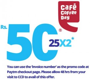 Use the Cafe Coffee Day invoice number as the promo code at PayTM checkout page. Please allow 48 hrs from your visit to CCD to avail of this offer. The invoice number can be used twice for getting Rs. 25 off on recharge of Rs. 50+.