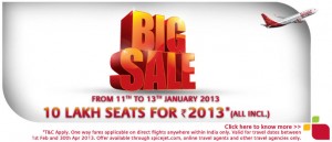 SpiceJet, India’s preferred low fare airline, presents The Big Sale, 10 lakh seats up for grabs at an all inclusive fare of Rs. 2013! Simply log on to www.spicejet.com and book direct flights to any domestic destination on SpiceJet, for travel between 1st February to 30th April, 2013.